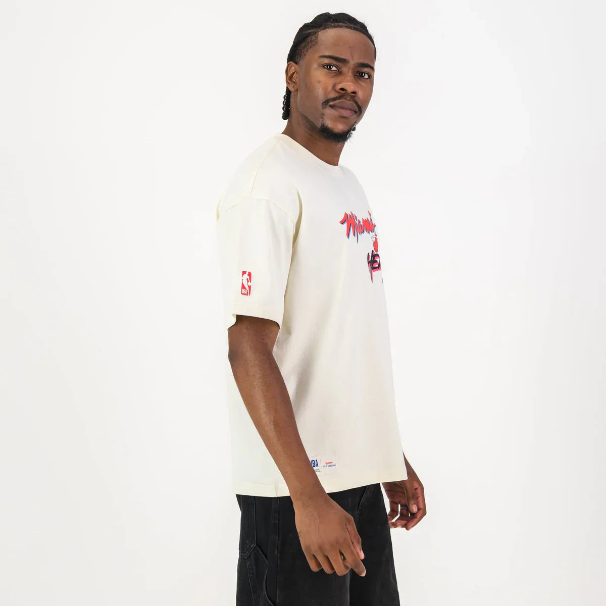 Bring the heat off the court. This unisex boxy tee delivers a relaxed, modern fit with serious Miami attitude. Finished in a soft ivory birch tone, it features bold Miami Heat front artwork that pops with colour and texture, giving the tee a strong retro-sports edge without feeling loud.Easy to wear, easy to style, and built for everyday rotation this is the kind of tee that does the talking for you. Part of the NBA Lifestyle Collection by Old School, blending heritage basketball energy